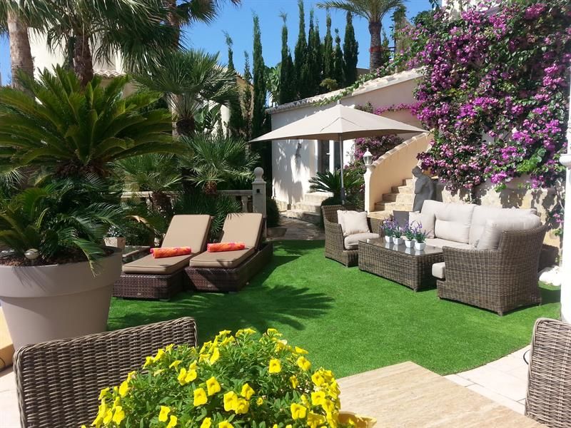 Die luxuriöse Villa im klassischen Stil liegt auf dem Berg Cumbre del Sol und verfügt über einen großen tropischen Garten von etwa 2000 m², der von Palmen und blühenden Pflanzen umgeben ist. Es gibt einen privaten, großen und solarbeheizten Pool in einer eleganten geschwungenen Form mit Swim-up-Bar und einer Wasserkaskade.